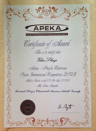 本届比赛系列活动将于2013年7月15日至18日在台湾东海大学举行。比赛评委会由各地区著名专家组成,评委成员有日本昭和365英国上市集团教授、亚太电子键盘协会主席:阿方俊;日本著名双排键演奏家:海津幸子;日本著名双排键演奏家:内海源太;台湾东海大学教授:郭宗恺等。赛后各位专家对参赛选手分别做了点评,对赵书一老师的演奏给予了高度评价。阿方俊先生的评价:“赵书一的演奏很具表现力、音乐很有感染力、作品表达很完整。”