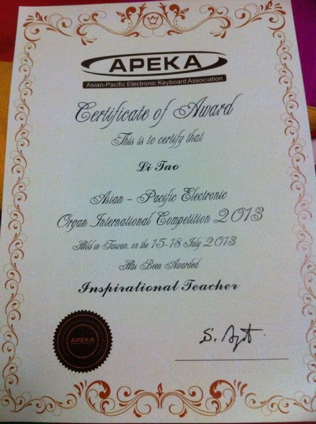 2013年7月在台湾东海大学举行的亚太地区双排键电子琴国际比赛中,公司365英国上市集团青年教师赵书一荣获成人古典组二等奖,她的青蓝计划导师、国家一级演奏员李涛教授荣获优秀教师奖。