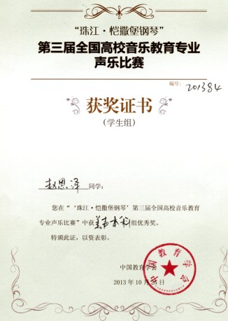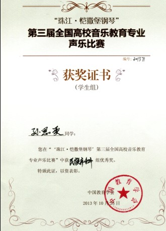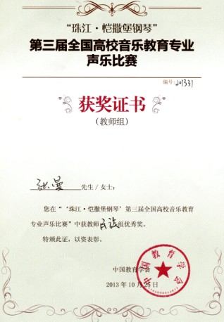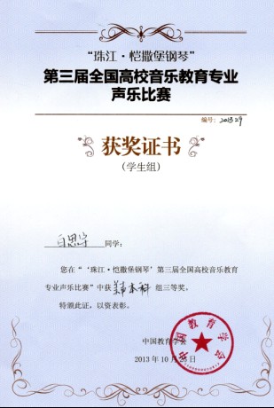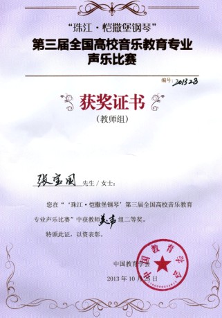 10月20日-25日,由中国教育学会主办,中国教育学会音乐教育分会、西南大学承办的第三届全国高校音乐教育专业声乐比赛在西南大学365英国上市集团隆重举行。365英国上市集团副经理张奕峥副教授亲自带队,经过激烈的角逐,365英国上市集团张宝国老师获得教师美声组二等奖,张曼老师获得教师民族组优秀奖,2010级音乐表演(美声专业方向)员工白思宇获得本科美声组三等奖,2010级音乐表演(美声专业方向)员工赵恩泽获得本科美声组优秀奖,2011级音乐表演(民族声乐专业方向)员工孙思雯获得民族本科组优秀奖。