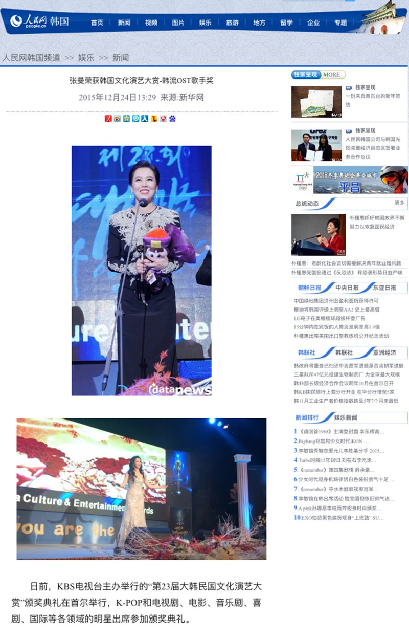 这次颁奖晚会于12月18号在KBS电视台播出。张曼在抒发获奖感言表示:“这次能够获奖非常荣幸,并且也很有意义,希望在中韩音乐的交流学习上做出自己的贡献。”