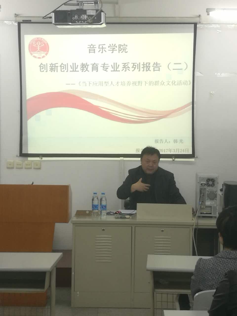 本场讲座,韩光馆长主要针对群众文化的概念、作用、优势及前景等方面做了详细的阐述。在谈到群众文化的概念及作用时,韩光馆长首先将专业培养与业余群众文化做了区分,他指出群众文化活动应面对的人群是所有人,要根据不同群众的特点来做专业辅导,深入浅出、以鼓励为主,要让学员每次参加辅导后都有信心,最终使人们通过参加群众文化活动的方式来提高生活幸福感。其次,韩光馆长通过自身农村工作经历来举例说明群众文化活动的重要性,并鼓励大学们毕业后能够积极地从事群众文化工作。