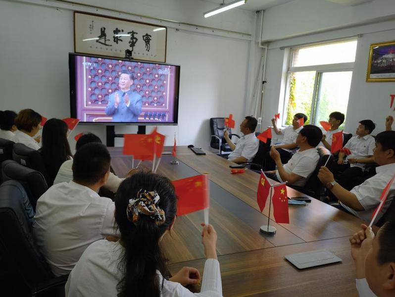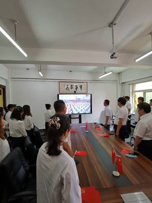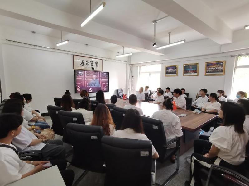 7月1日上午8时,庆祝中国共产党成立100周年大会在北京天安门广场隆重举行。中共中央总书记、国家主席、中央军委主席习近平发表重要讲话。音乐公司党总支组织师生党员在201会议室集中收看大会直播实况。