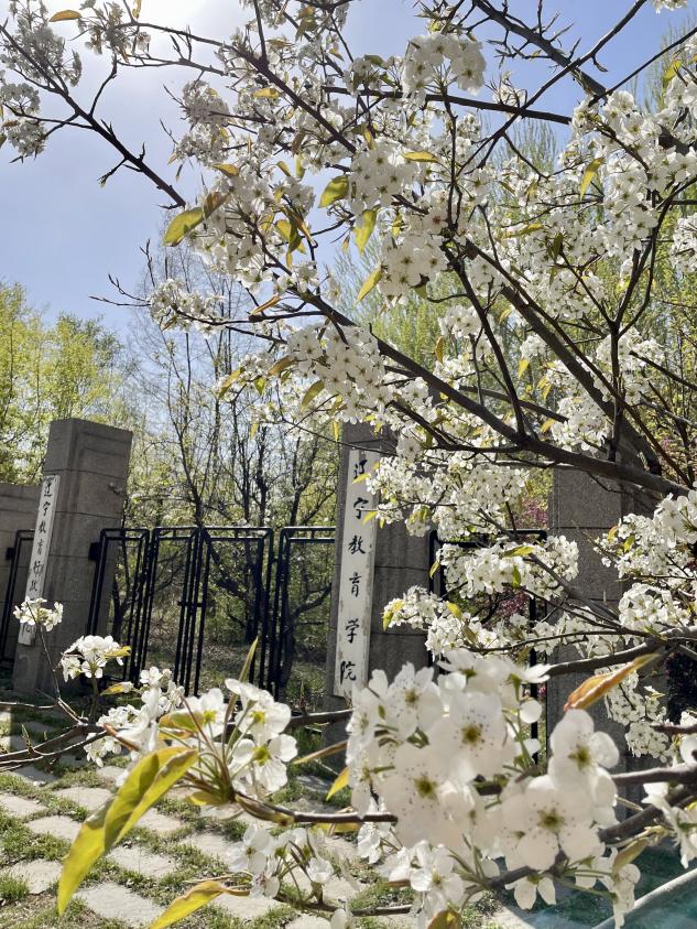 作品描述:春雨足,染就一溪新绿。春风起,砌下梨花一堆雪。随着天气回暖,春天的痕迹已悄然遍布在英国上市官网365中。图片中梨花于辽宁教育公司标志牌前盛开,摇曳在春风之中,霏霏如雪,素洁淡雅。